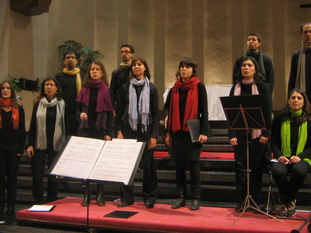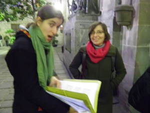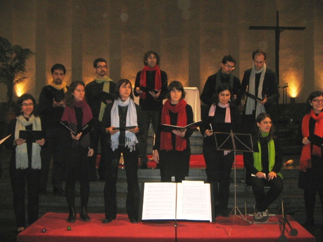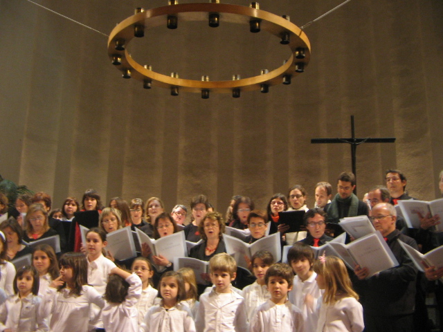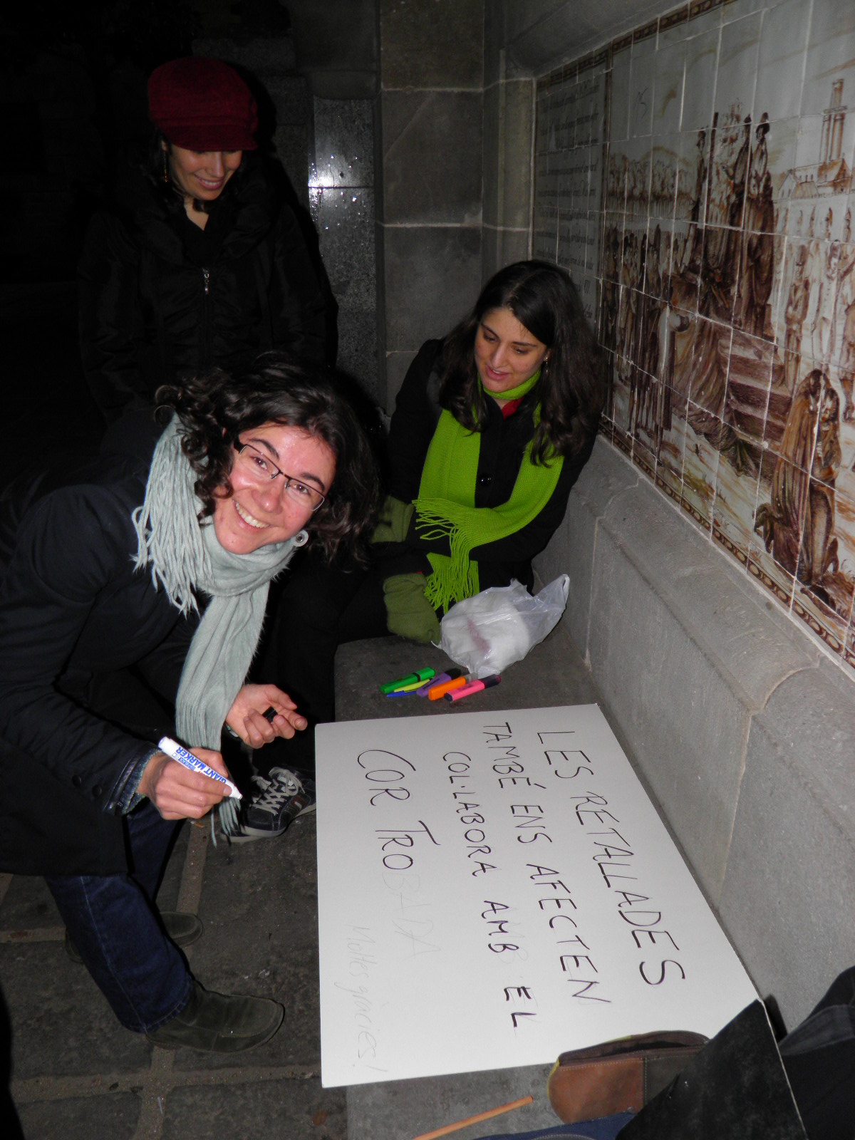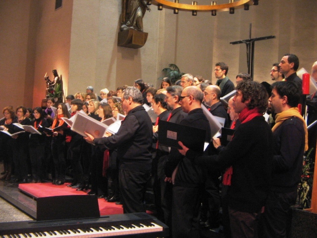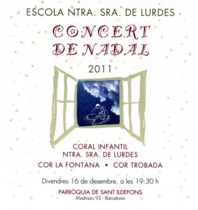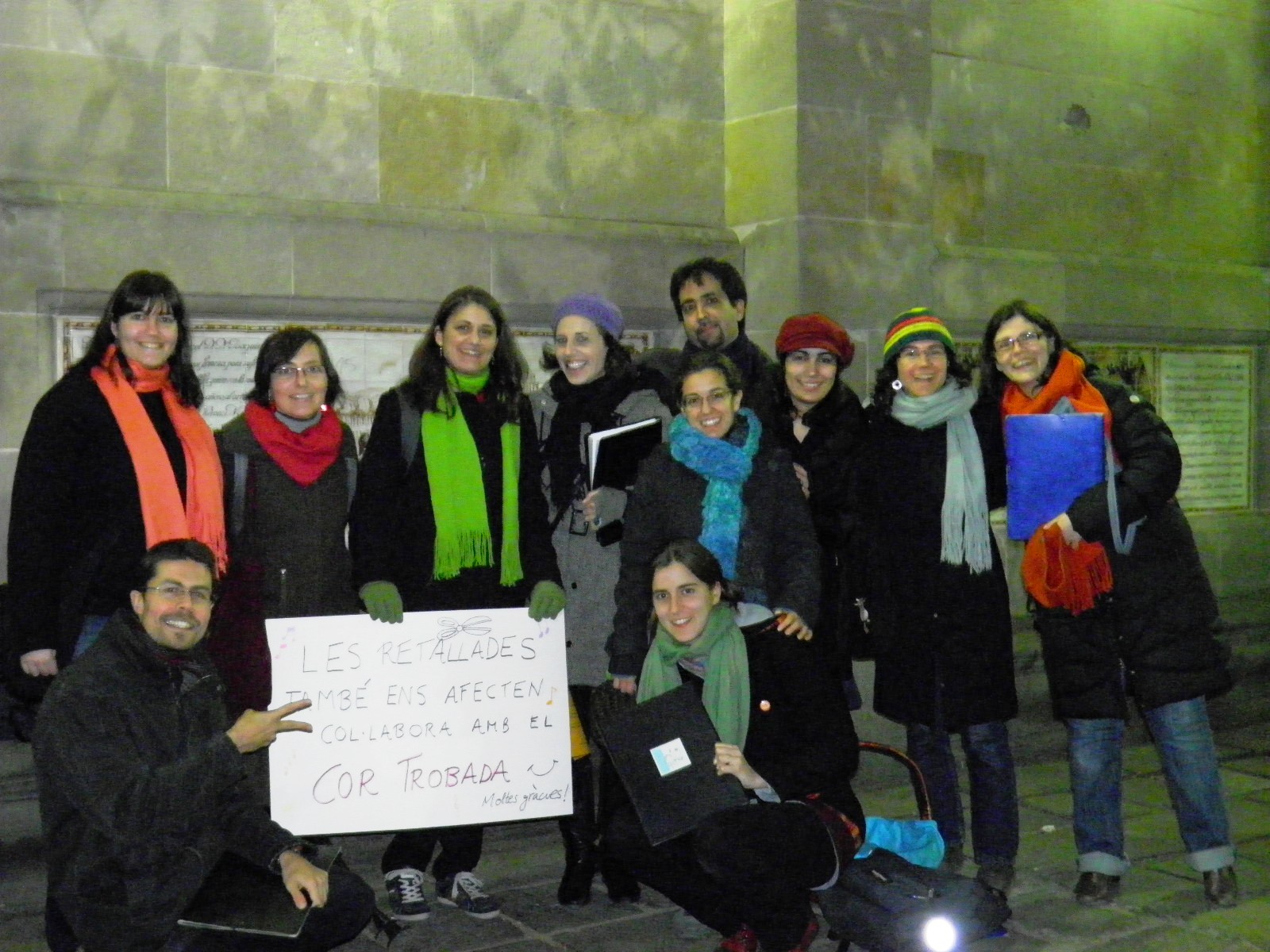 El diumenge 18 de desembre alguns dels cantaires del Trobada vam fer una cantada de nadales. Reunits a la plaça del costat de la catedral (accés porta del claustre), ben abrigadets, lluint vistosos colors i amb les partitures a les mans, vàrem entonar cançons tradicionals catalanes, espanyoles i anglosaxones de Nadal. A més del plaer i el gaudi de cantar a l’aire lliure, la trobada també tenia per finalitat recollir alguns calerons per participar en la trobada internacional de corals, organitzada a Torino entre juliol i agost de 2012 (aviat us direm més d’aquesta estimulant iniciativa!). Com resava la pancarta: “Les retallades també ens afecten! Col·labora amb el Cor Trobada”.